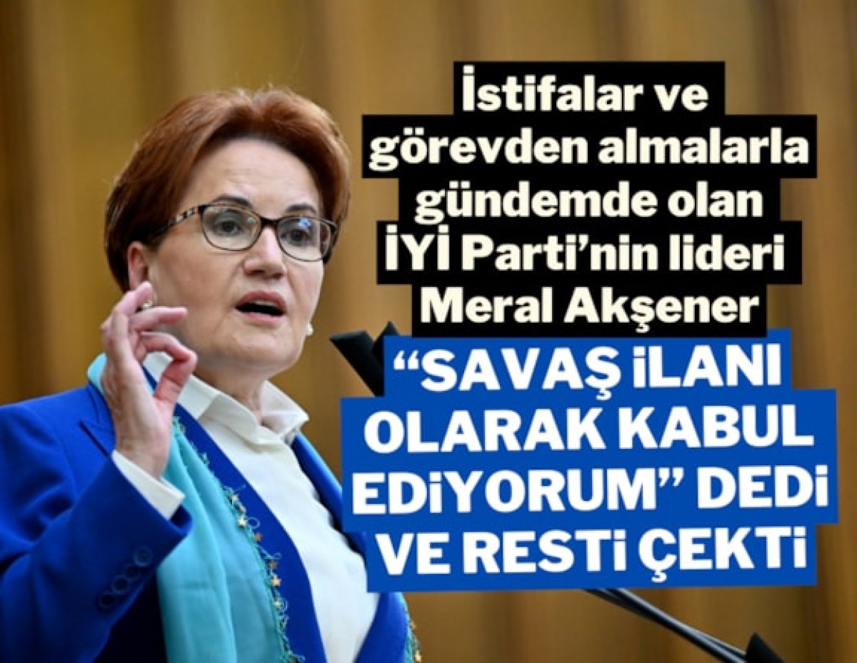 Yerel seçimlere müstakil girme kararının ardından son günlerde istifaların ardı arkası kesilmeyen İYİ Parti'den dikkat çeken açıklama... "Partimize kurumsal operasyon olduğu ortaya çıktı" diyen Akşener "Bu, bir siyasi partinin içişlerine karışmak demektir. Şu an itibariyle bir savaş ilanı olarak kabul ediyorum. Varım, buyursunlar. Ben idmanlıyım" ifadelerini kullandı.