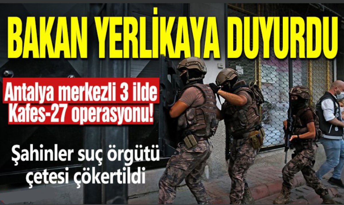 Bakan Yerlikaya, sosyal medya hesabından yaptığı açıklamada, Kaçakçılık ve Organize Suçlarla Mücadele Daire Başkanlığı koordinesinde, Antalya Kaçakçılık ve Organize Suçlarla Mücadele Şube Müdürlüğü tarafından 'Ulusal organize suç örgütü elebaşı Sedat Şahin'in adını kullanan Şahinler' olarak bilinen organize suç örgütüne yönelik Antalya, Kocaeli ve Muğla'da 'Kafes-27' adı verilen eş zamanlı operasyon düzenlendiğini bildirdi.