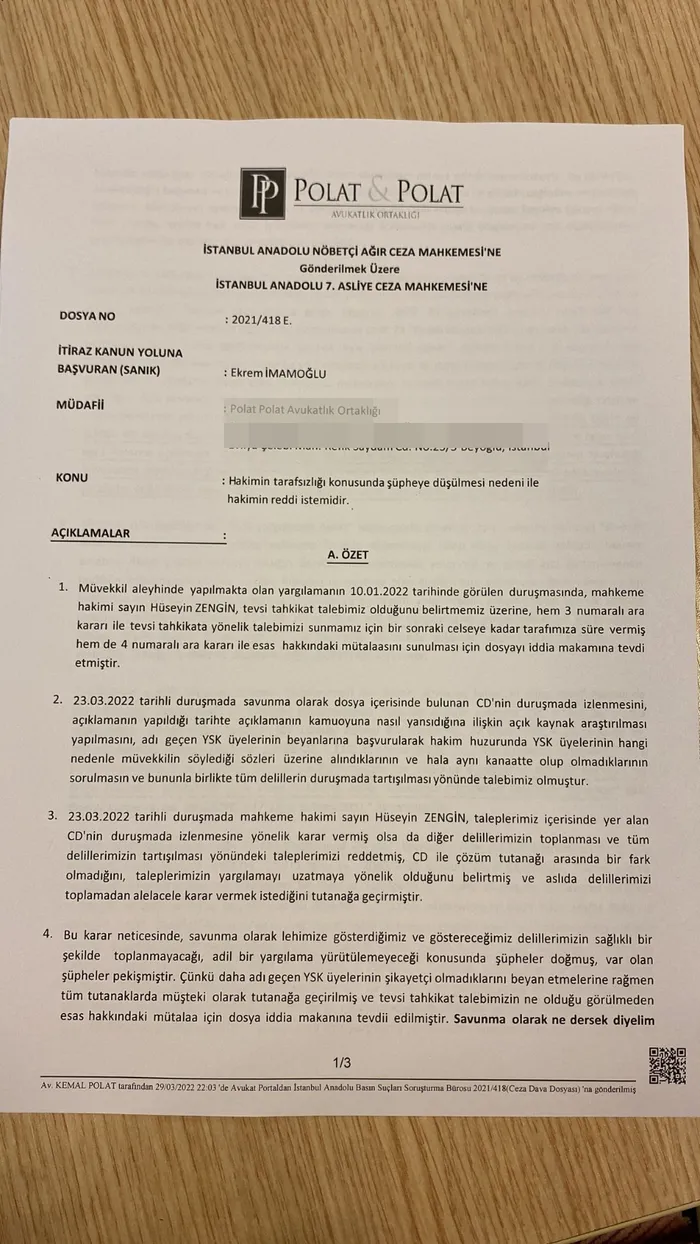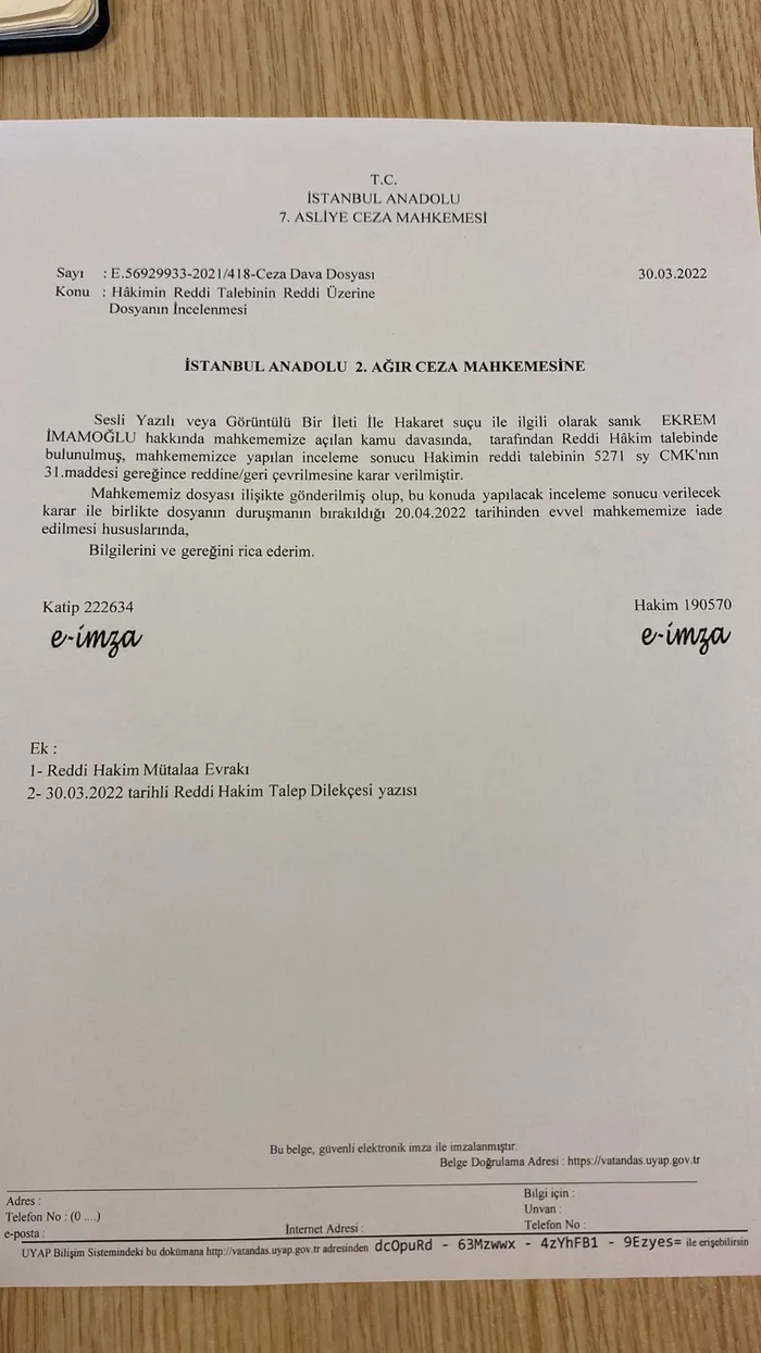 Davanın görüldüğü İstanbul Anadolu 7'nci Asliye Ceza Mahkemesi'ne gönderilen talepte hakimin, davada ceza vermekte acele ettiği belirtildi. İmamoğlu'nun avukatı aracılığıyla reddi hakim talebindeki yazısında şu ifadeler dikkat çekti: