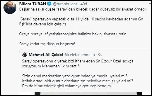 Öte yandan AK Parti Grup Başkanvekili Bülent Turan da CHP'deki 'Saray' siyasetini eleştiren bir tweet attı. Turan, Mehmet Ali Çelebi'nin bu twetini alıntılayarak, "Saray kadar taş düşsün başınıza!" dedi. Turan, mesajında şunları ifade etti: