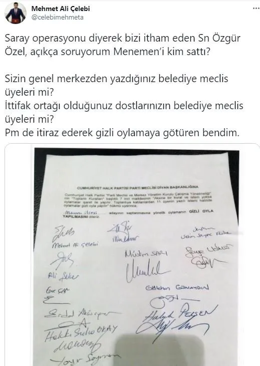 İzmir Milletvekili Mehmet Ali Çelebi, Karabük Milletvekili Hüseyin Avni Aksoy ve Yalova Milletvekili Özcan Özel, Cumhuriyet Halk Partisinden istifa etti. İstifaları CHP Grup Başkanvekili Özgür Özelin Saray Operasyonu diye tanımlamasına sert çıkan İzmir milletvekili Çelebi Saray operasyonu diyerek bizi itham eden Sayın Özgür Özel, açıkça soruyorum Menemen’i kim sattı? diyerek çok sert çıktı..