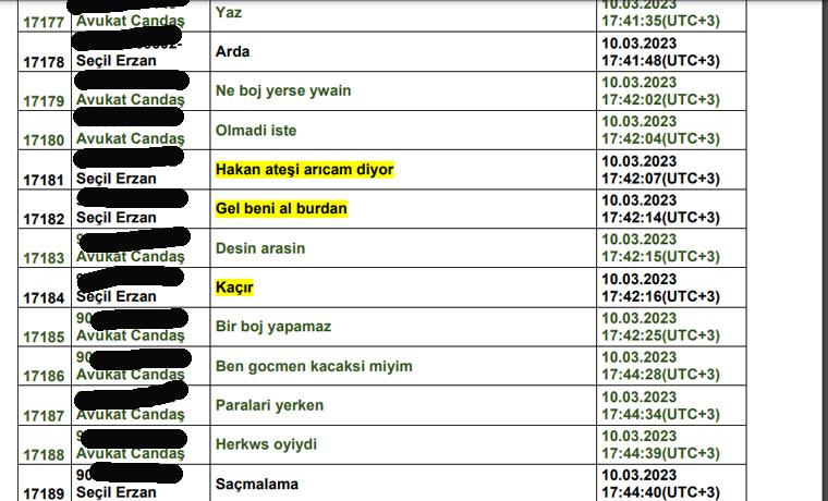 Bu davadaki önemli isimlerden Fatih Terim’in yakın çalışma arkadaşı Müfit Erkasap’ın eşi Nur Erkasap’la Seçil Erzan arasında da WhatsApp mesajları var. Bu yazışmalarda Nur Erkasap Fatih Terim olması muhtemel FT için “FT’de de iş yokmuş” diyor, Seçil Erzan da bu mesaja karşılık “Bulsa o bulurdu zaten” cevabını veriyor.
